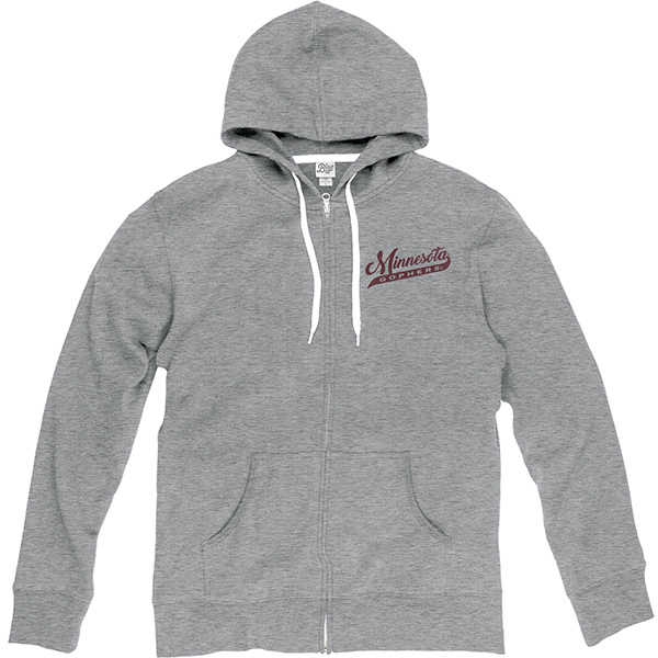 This full zip hoodie from Blue 84 features a distressed Minnesota in a script font on the left chest with a Gophers in the tail of the 'A'. This hoodie also has back art! The back includes a distressed, script font Minnesota with a Gophers in the tail of the 'A', a Charging Goldy buttressed by an 1851 in the middle and an arched Twin Cities, Minnesota underneath.