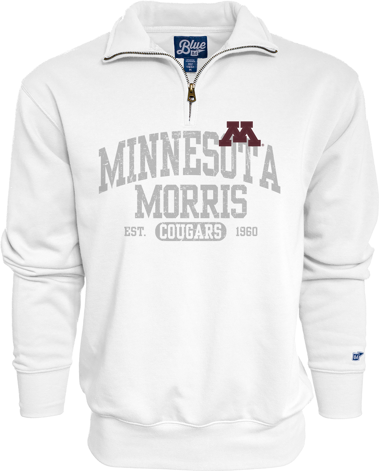 This fleecy 1/4 zip has a comfy relaxed fit. It features a screen printed Minnesota and Morris across front chest, and a M on the left chest. Garment is 9oz soft comfy fabric with side rib panels and front pouch pocket.