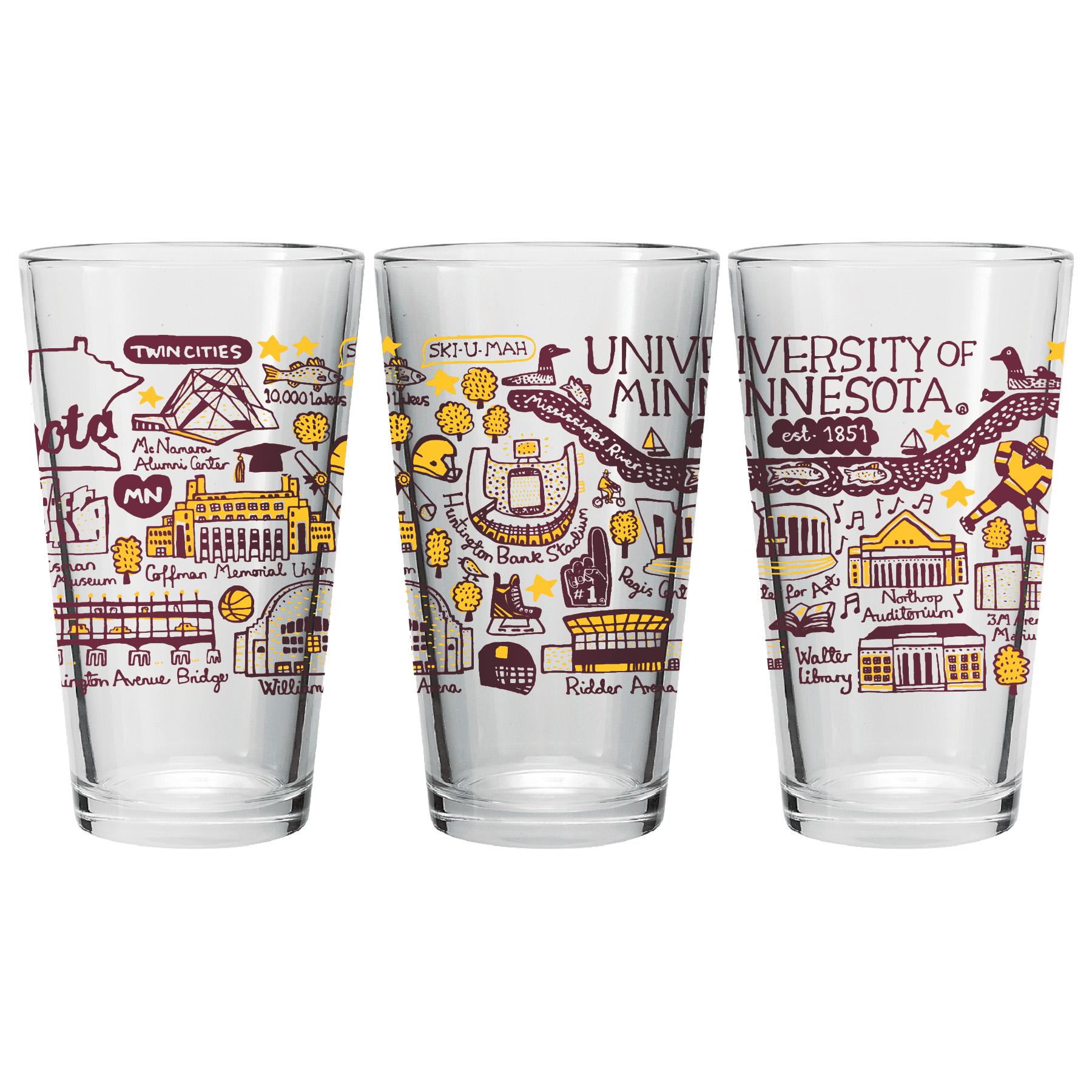 Raise a toast to Gopher pride with this Julia Gash University of Minnesota pint glass! Featuring her signature hand-drawn illustrations that highlight beloved campus landmarks and Minnesota spirit, this glass adds a touch of artistry to every pour. Perfect for at home drinks, a gift, or as a keepsake for any proud Gopher fan!